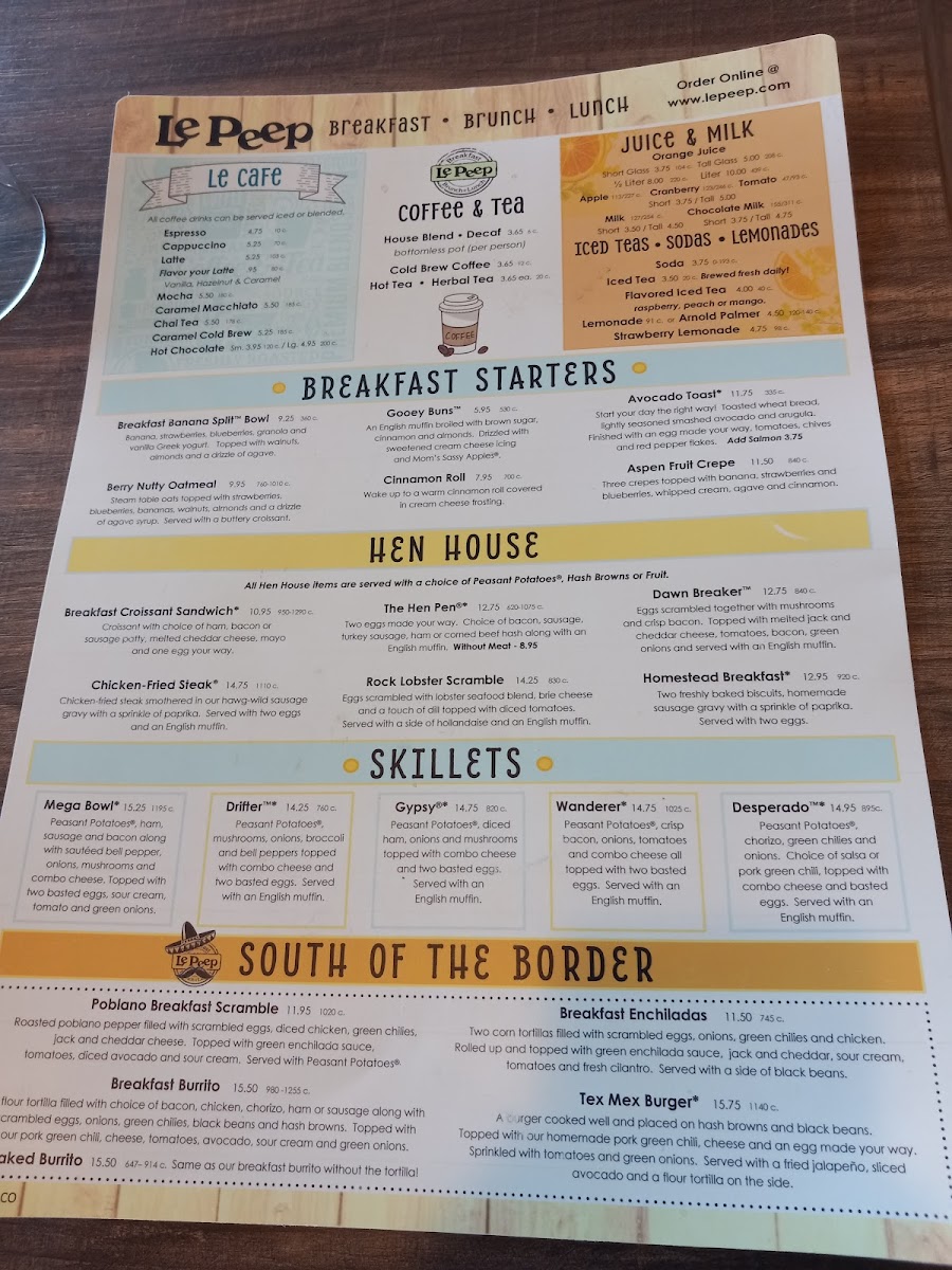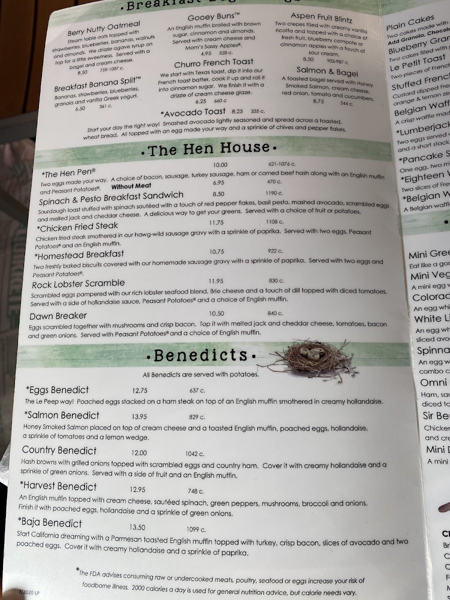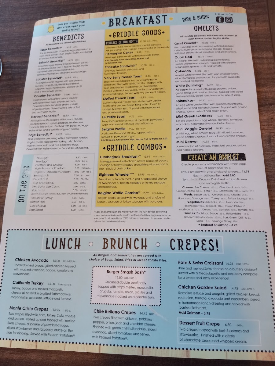 The Le Peep way! Poached eggs stacked on a ham steak on top of an English muffin smothered in creamy Hollandaise. Served with Peasant Potatoes®.